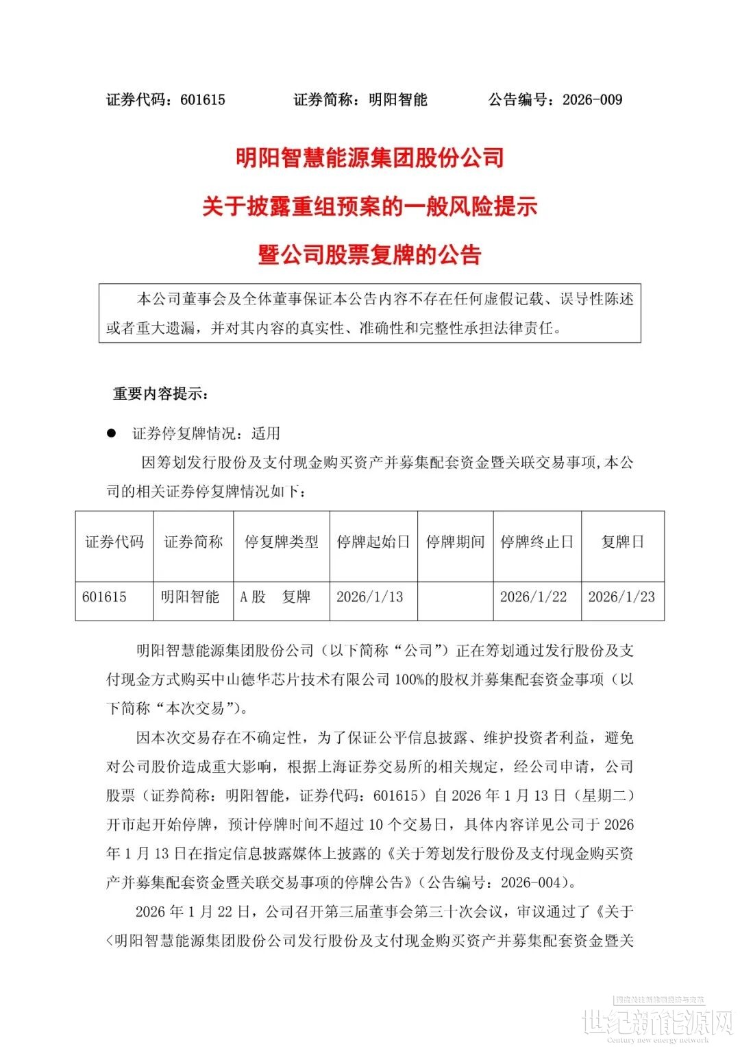 1月23日明陽(yáng)智能開(kāi)市復(fù)牌漲停,總市值達(dá)到489.61億元。此前公司公告,于2026年1月12日收到控股股東能投集團(tuán)的通知,擬通過(guò)發(fā)行股份及支付現(xiàn)金的方式收購(gòu)德華公司控制權(quán),并募集配套資金。