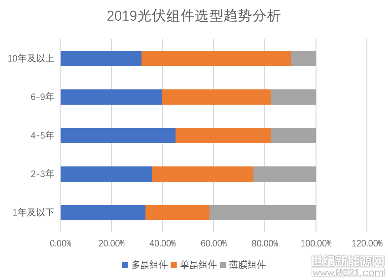 2019年選擇多晶組件產品的意愿持續降低,與單晶產品基本持平。同時,選擇薄膜太陽能產品的意愿回升,同比上年+8%。